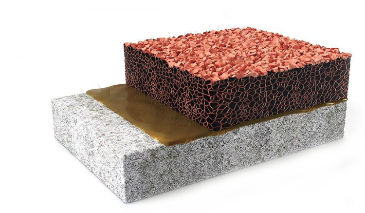 Высокая плотность покрытия и большая площадь контакта соседних крошек делает покрытие устойчивым к разрушению. Красим всю крошку. Окрашиваем не верхний слой готового изделия, а резиновую крошку полностью. Если при эксплуатации стирается часть покрытия, цвет остается прежним.